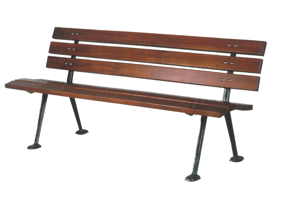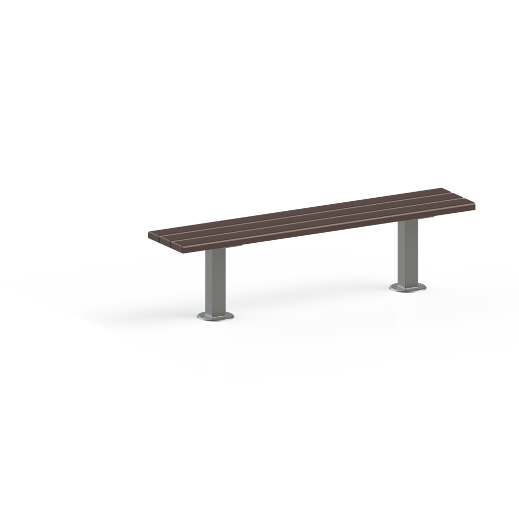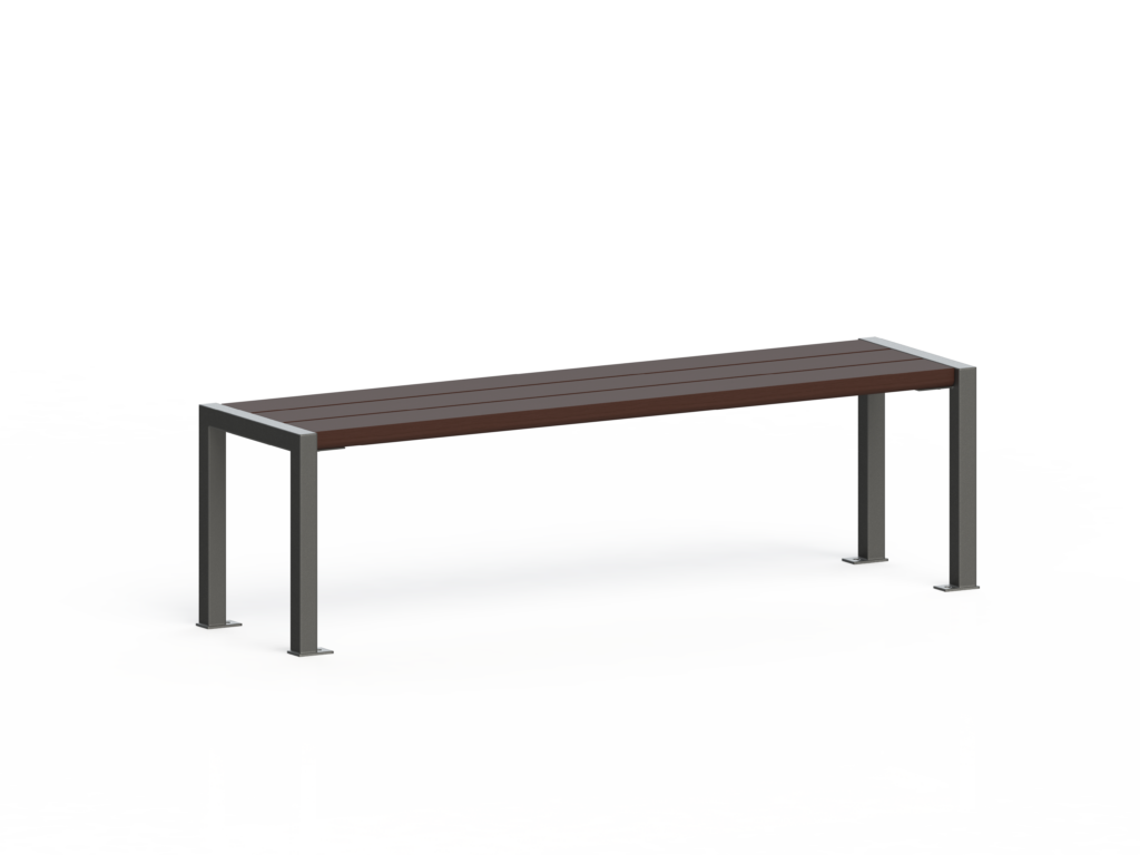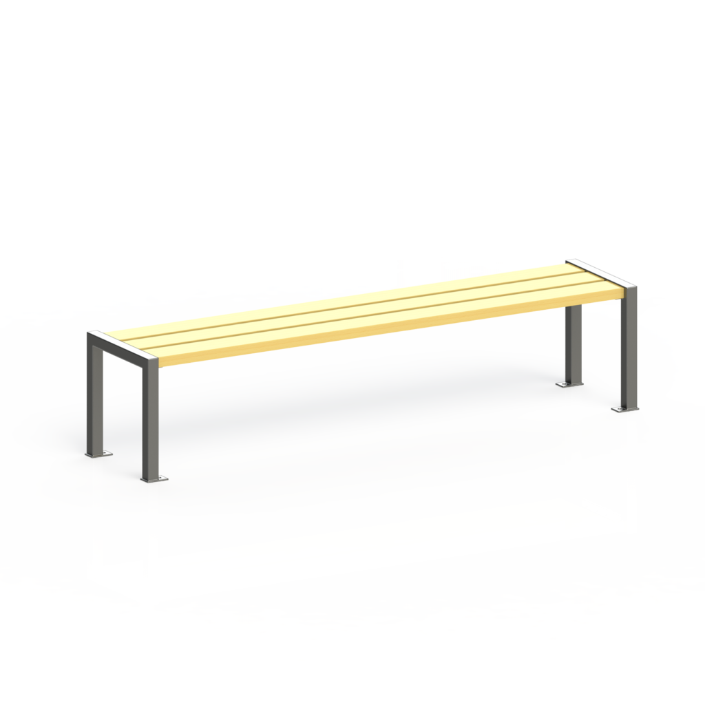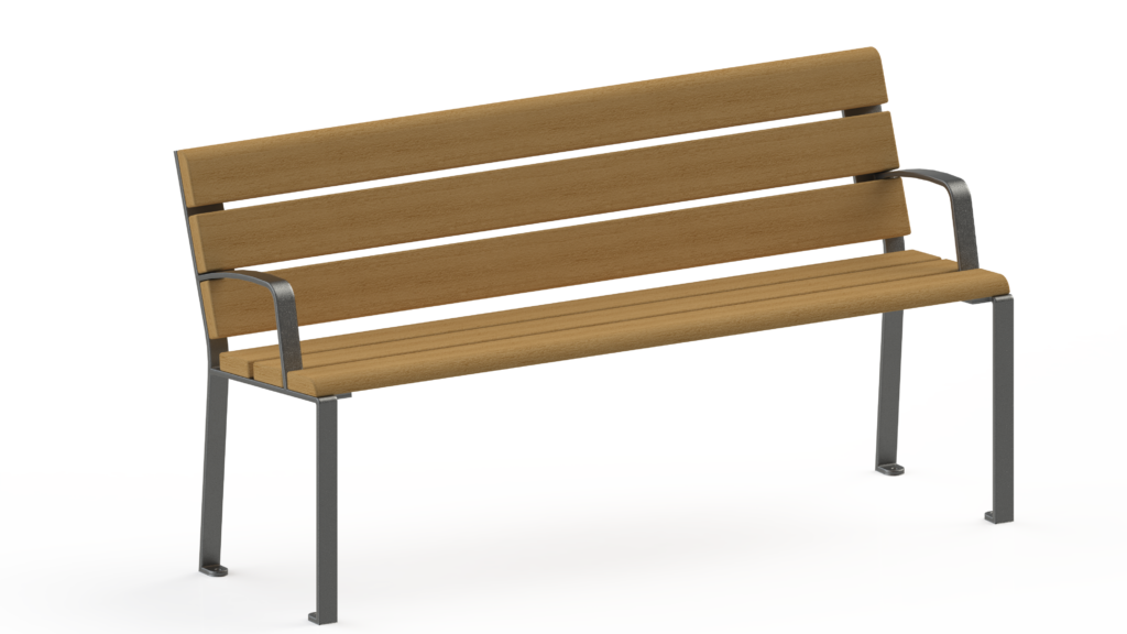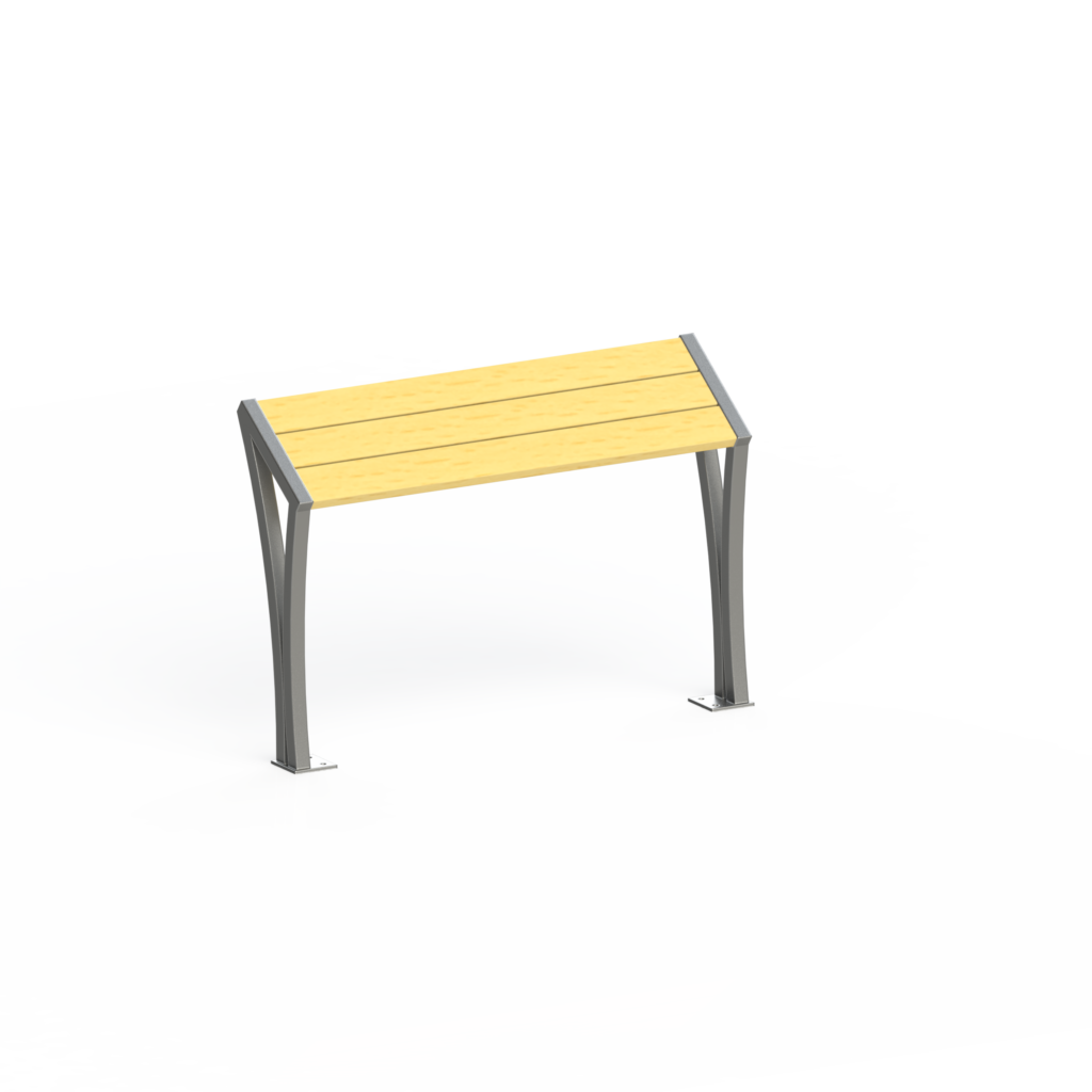 Banc : 2 lattes dossier et 3 lattes d’assise de profil tubulaire 60 x 30 mm, soudées sur l’ossature.