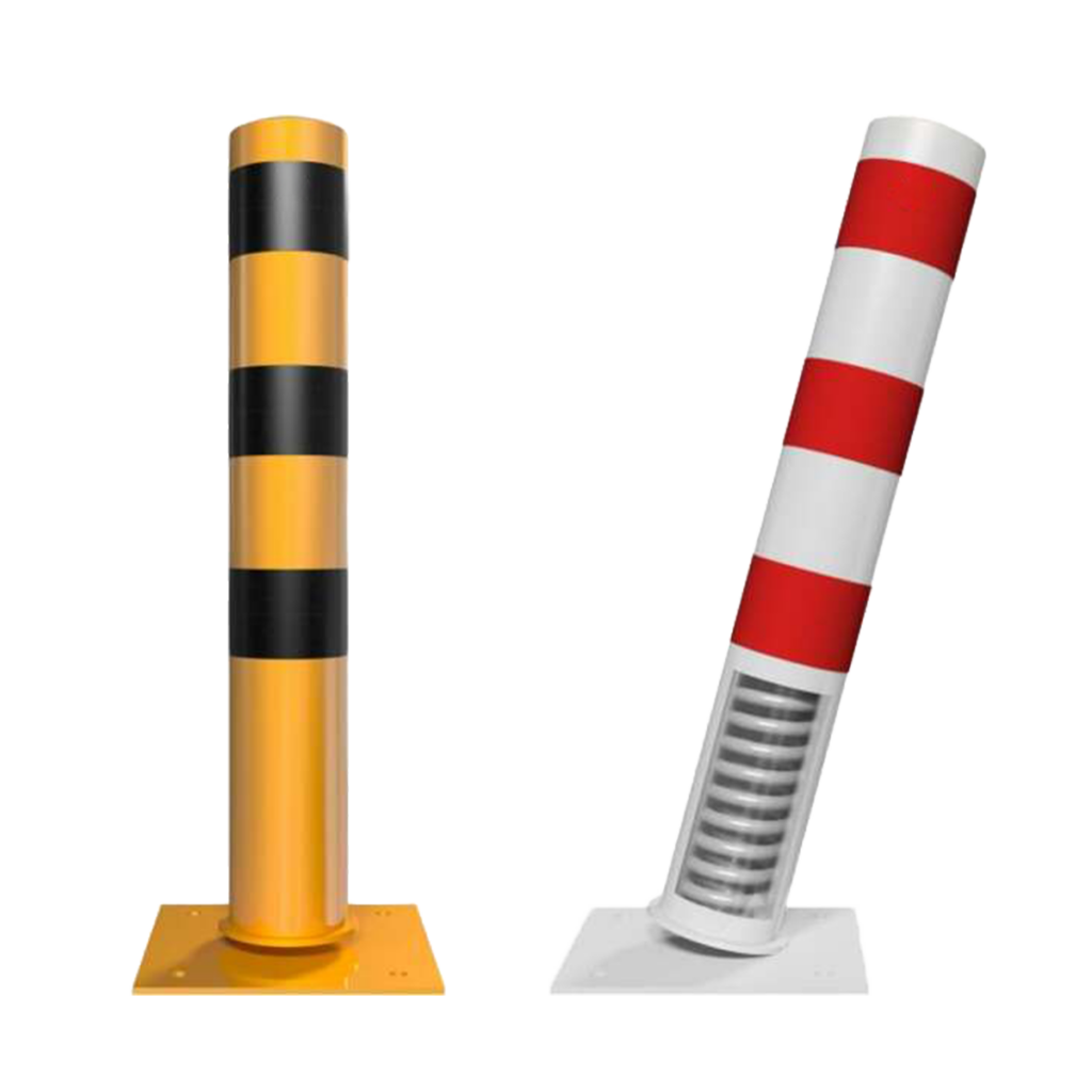 angle arrondi, soudée au corps de la borne. Soudure meulée et poncée. - Articulation avec inclinaison dans tous les sens lors d’une poussée ou d’un choc léger grâce à un ressort à forte traction fixé à l’intérieur de la borne et sur la platine.